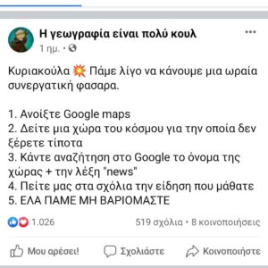 Κι εκτός όλων αυτών ανεβάζει κάτι απίστευτα link για φοβερά παιχνίδια γεωγραφίας, ραδιόφωνα από όλο τον κόσμο, βιβλία, χάρτες και πολλά άλλα ενδιαφέροντα. Εξάλλου δεν είναι τυχαίο το γεγονός πως υπάρχουν πάνω από 160.000 άτομα που ακολουθούν τη σελίδα. Μη χάνετε λοιπόν καιρό και σας εγγυώμαι πως θα είναι ότι πιο όμορφο θα εμφανίζεται στην αρχική σας σελίδα! Μη ξεχάσετε να στείλετε προσκλήσεις στους φίλους σας ώστε να γίνουν κι αυτοί γεωγραφόπουλα!