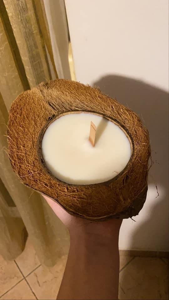 “Χθες έφερα στο φως τα κεριά μέσα σε καρύδα! Χρησιμοποιώ το κέλυφος της καρύδας και βάζω ξύλινο φυτίλι για να δίνει το vibe που έχουμε όταν είμαστε στη θάλασσα με την παρέα μας, νύχτα, με μια φωτιά γύρω μας και ακούμε το ξύλο να καίγεται σιγά σιγά. Τέτοιο ήχο κάνει αυτό το φυτίλι!! Αρχές Ιουνίου -ίσως και πιο νωρίς- έρχονται τα αντικουνουπικά κεριά γιατί ξέρω ποσό δύσκολη είναι η συνύπαρξη μας με τα κουνούπια. Τέλος, έρχονται pots από τσιμέντο. Θα είναι χειροποίητα από εμένα και μέσα θα υπάρχει κερί. Όταν τελειώσει το κερί, το γλαστράκι (το pot δηλαδή) προτείνω να χρησιμοποιηθεί για να φυτέψουμε ένα φυτό! Με αυτό τον τρόπο θα γεμίσουμε με όμορφα χρώματα το μπαλκόνι και τη γειτονιά μας!!”