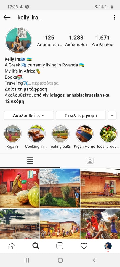 Από τη μέρα που ανακάλυψα το λογαριασμό της @Kelly_ira περιμένω καθημερινά τα story της! Η Κέλλυ είναι μια Ελληνίδα που ζει στη Ρουάντα και μας μεταφέρει μέσα από τις φωτογραφίες της καθημερινές στιγμές των κατοίκων. Φωτογραφίες γεμάτες χρώματα, τοπικά καφέ, μαγαζιά με τρόφιμα, ανθρώπους εν ώρα εργασίας. Δεν θα παραλείψω να πω πως λατρεύω τις φωτογραφίες των βιβλίων που ανεβάζει αλλά και των υπέροχων πιάτων που μαγειρεύει. Ακολουθήστε την και ταξιδέψτε.